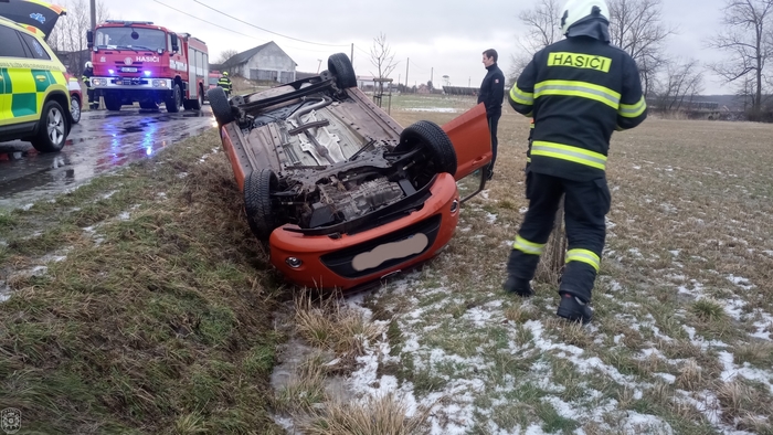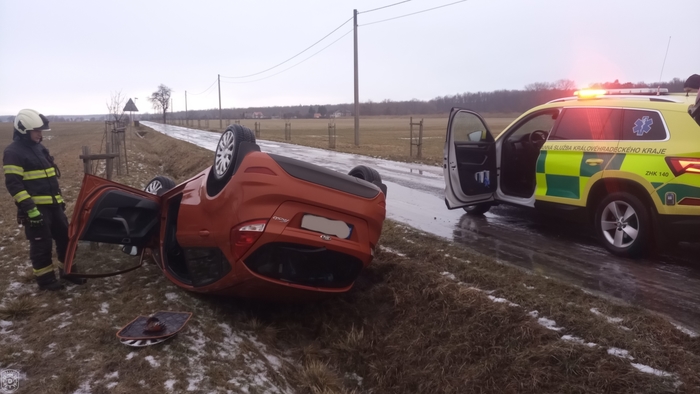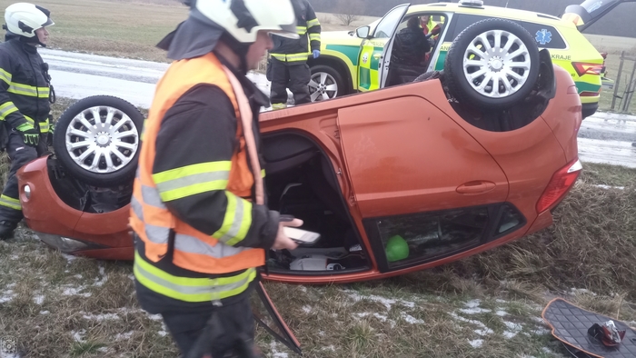 Jednotka vyjela, spolu s profesionálními hasiči z novobydžovské hasičské stanice, k dopravní nehodě osobního vozidla. Po příjezdu na místo události hasiči zjistili, že vozidlo skončilo mimo komunikaci na střeše. Zraněná řidička byla tč. již v péči posádky ZZS. Hasiči provedli protipožární opatření. Po ukončení záchranných prací se jednotka z novobydžovské stanice vrátila na svoji základnu. Naše jednotka zůstala, dle pokynů VZ, na místě do příjezdu rodinného příslušníka řidičky. Do té doby poskytli hasiči tepelný komfort svého zásahové vozidla řidičce. Po příjezdu rodinného příslušníka se naše jednotka vrátila zpět na svoji základnu.