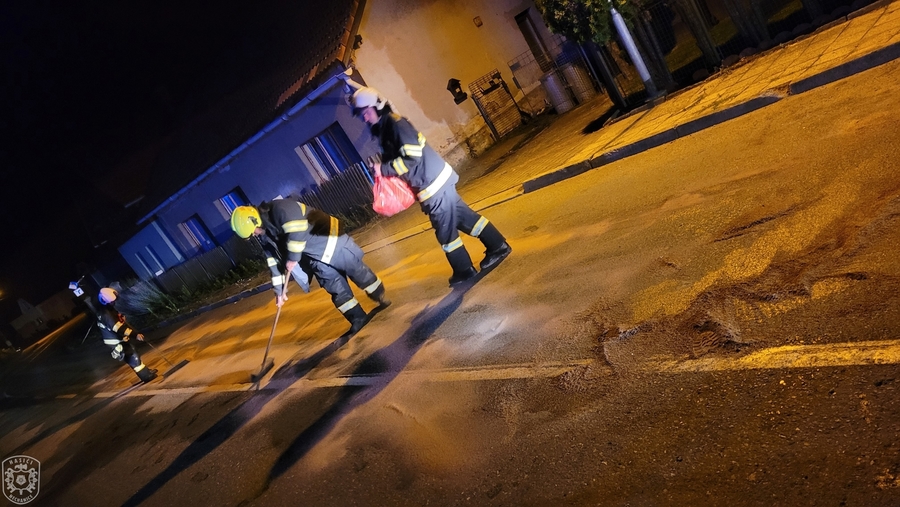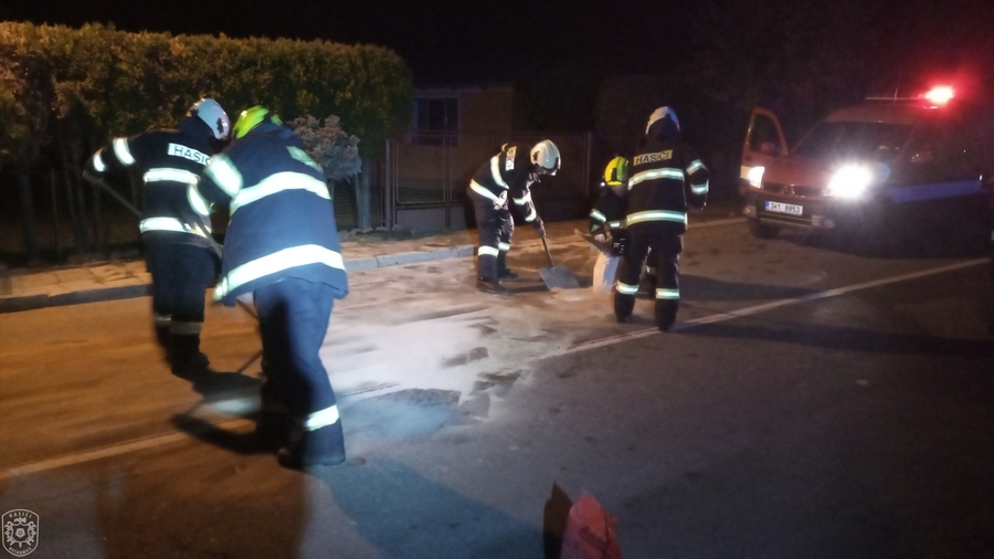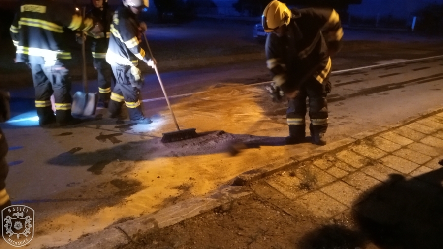 Jednotka vyjela, spolu s profesionálními hasiči z Nového Bydžova, k odstranění olejové skvrny na komunikaci v obci Nechanice místní části Suchá. Průzkumem na místě události hasiči zjistili, že se na místě nachází olejová skvrna přes jeden jízdní pruh v délce cca 1 metru. Olejovou skvrnou před příjezdem hasičů projelo nákladní vozidlo, které olej rozneslo v délce cca 15 metrů. Hasiči jak skvrnu, tak stopy od vozu, odstranili za pomocí sorbentu. Po úklidu se obě jednotky vrátily na svoje základny.