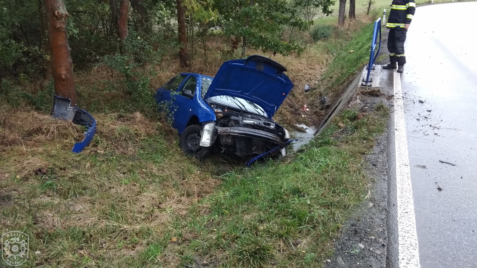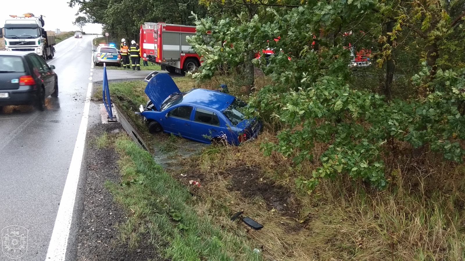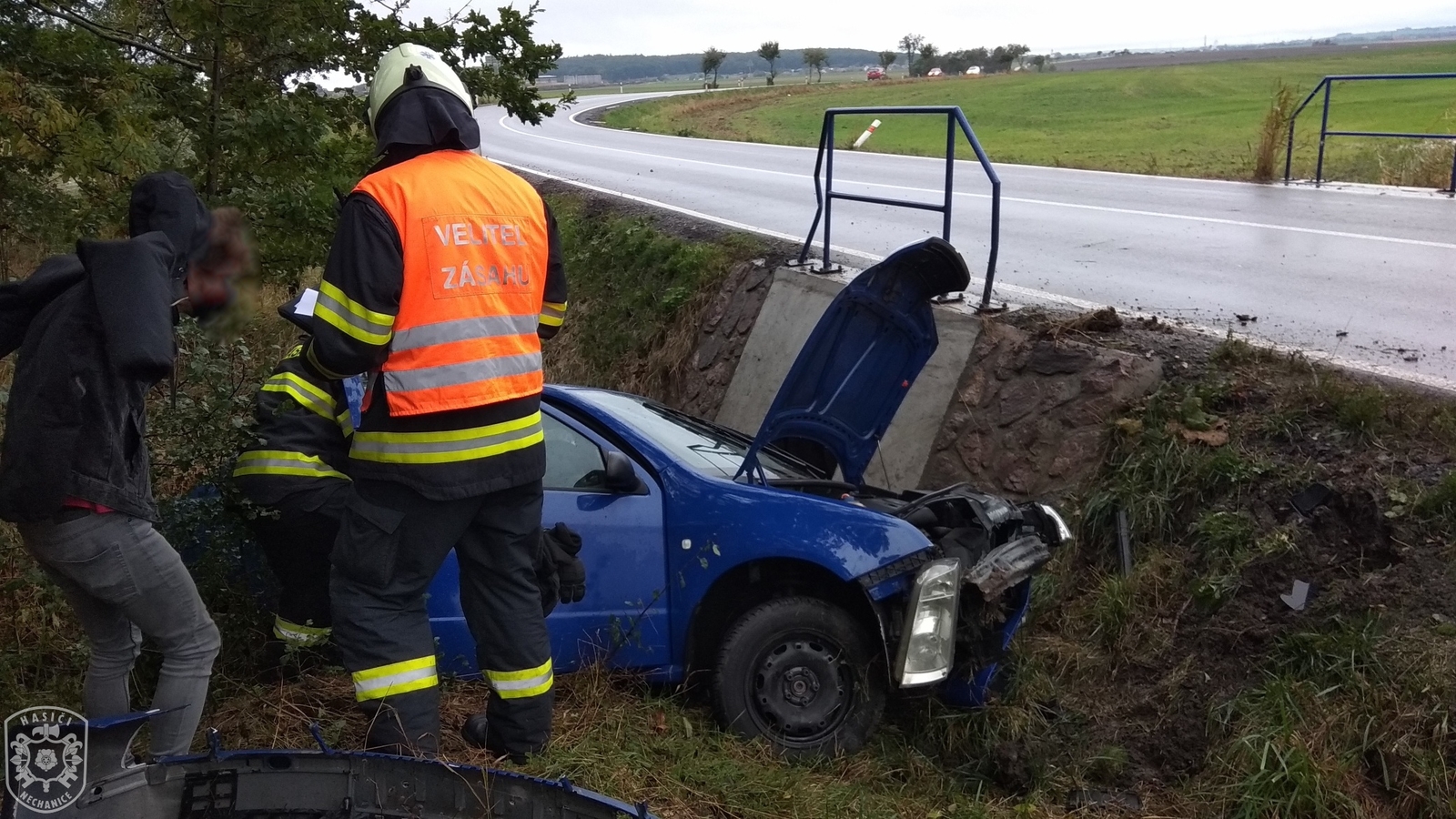 Jednotka vyjela, spolu s profesionálními kolegy z novobydžovské požární stanice, k odstranění následků dopravní nehody jednoho osobního automobilu. Při příjezdu hasičů se řidič nacházel mimo vozidlo. Hasiči provedli protipožární opatření. K úniku PHM nedošlo. Po provedení záchranných pracích se profesionální jednotka vrátila zpět na svoji základnu. Naše jednotka vyčkala na místě na příjezd dopravní policie a po zadokumentování nehody vyprostili vozidlo z příkopu a pomohli s naložením na odtahovou službu. Při této činnosti musela být komunikace na nezbytně dlouho dobu zcela uzavřena pro veškerý provoz. Nakonec očistili komunikaci od nečistot a poté se jednotka vrátila na svoji základnu.