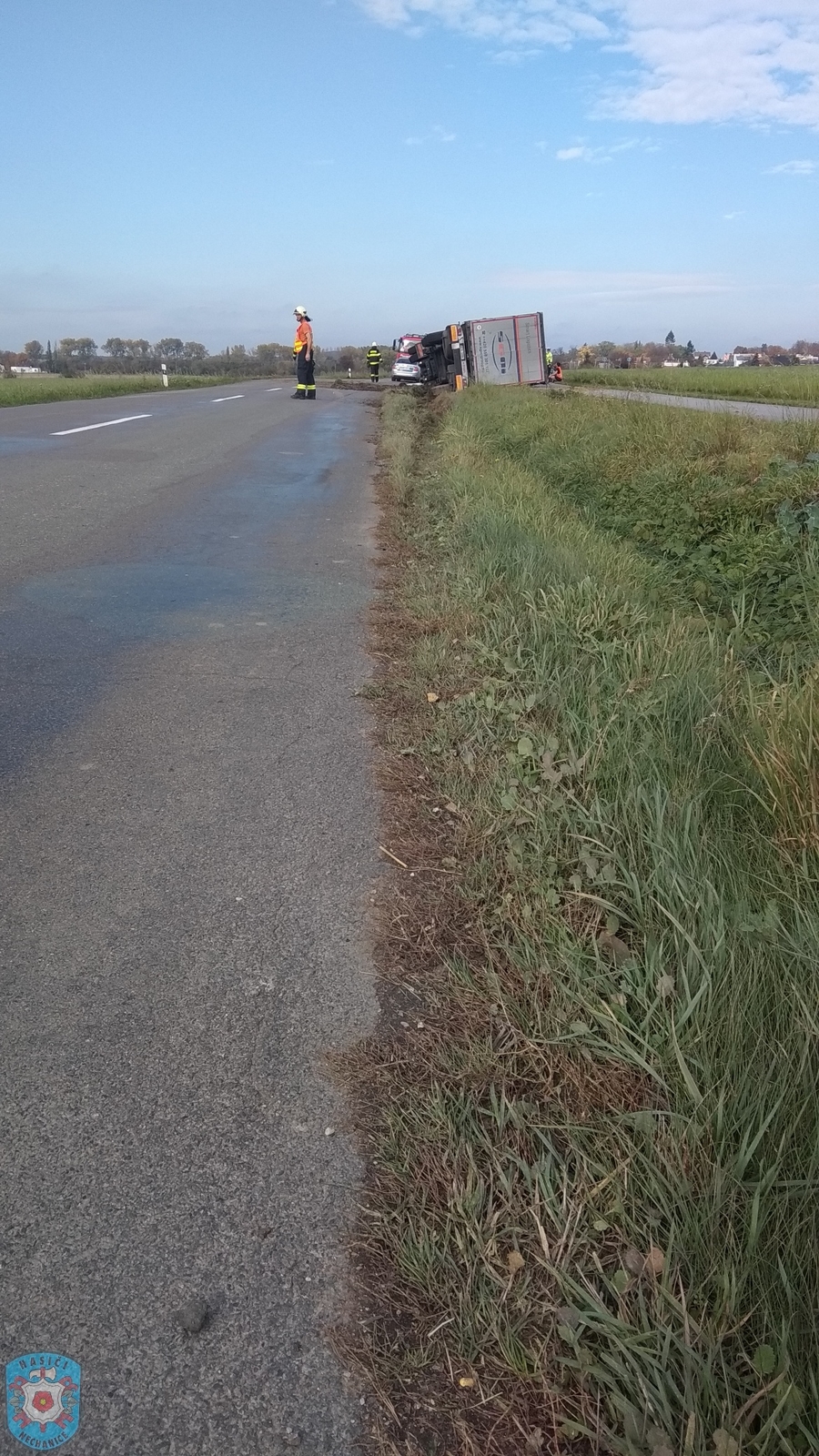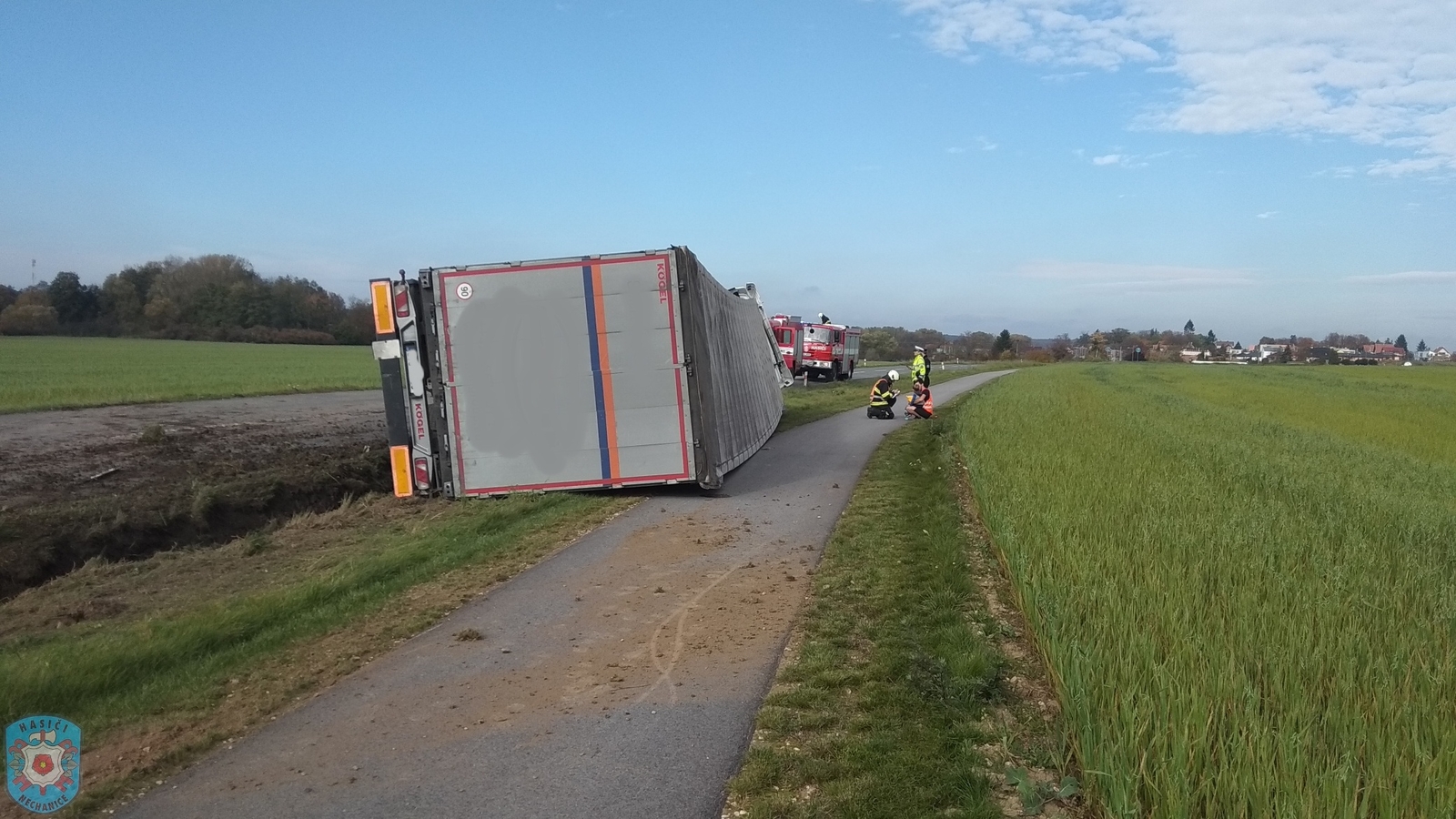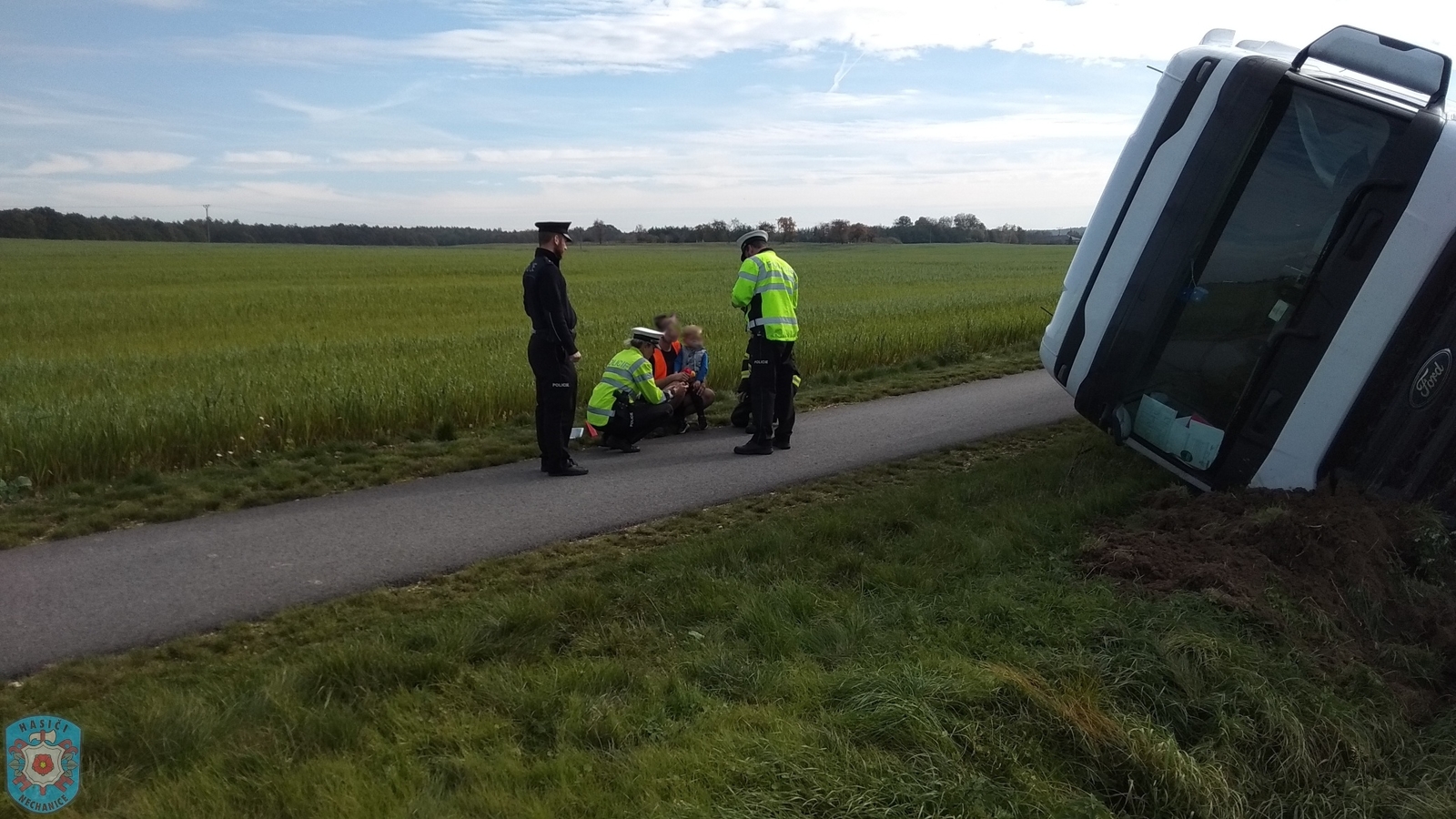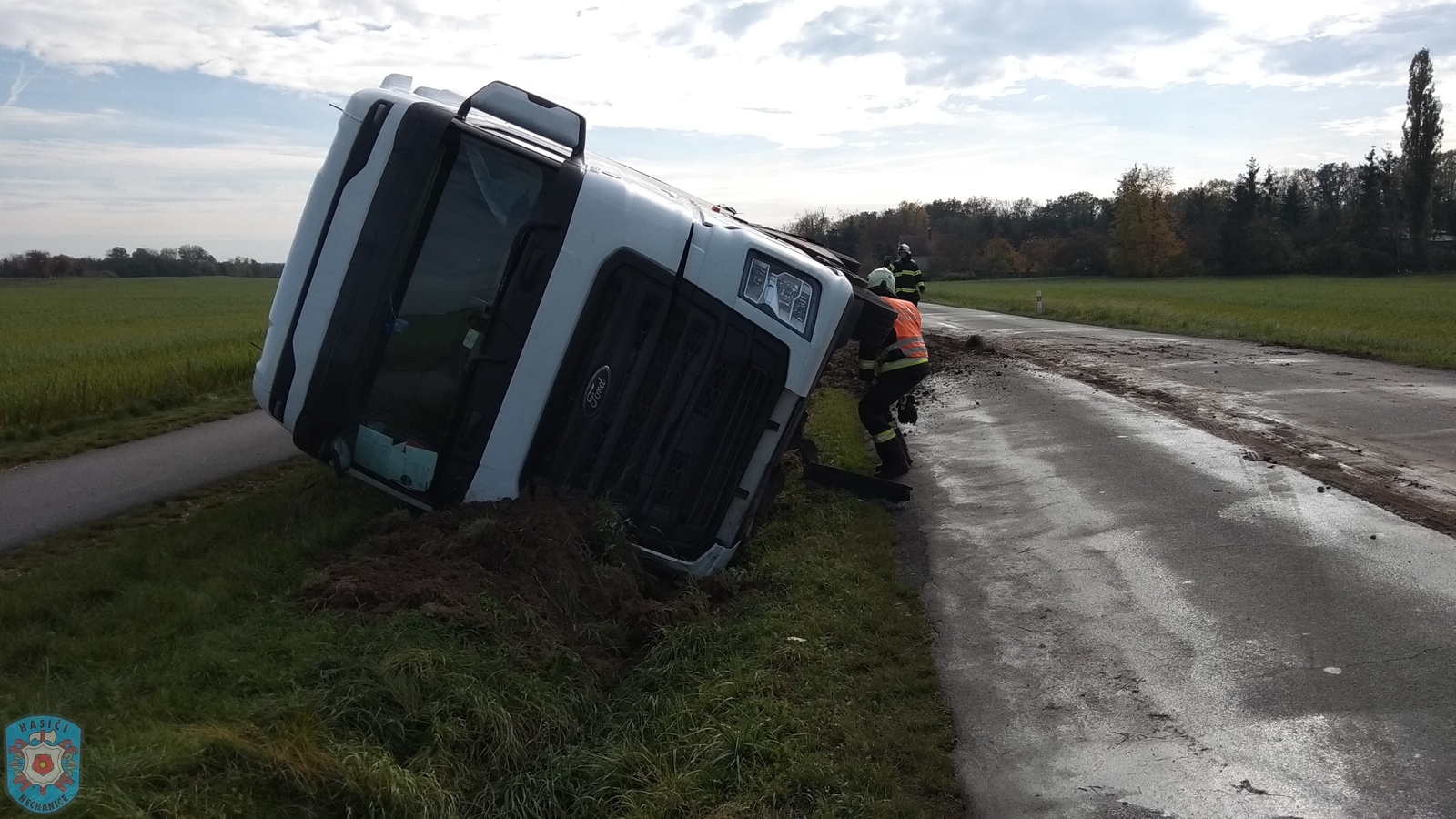 Spolu s profesionálními kolegy z Nového Bydžova jsme vyjeli k odstranění následků dopravní nehody jednoho nákladního vozidla, se kterým se utrhla krajnice a skončil převráceny na boku v příkopu mezi silnicí a cyklostezkou. V době příjezdu na místě hlídka PČR. Posádka byla v době příjezdu mimo nákladní vozidlo. Hasiči poskytli jednomu členovi posádky nákladního vozidla, kterým bylo malé dítě, psychologickou PP a věnovala dítěti dráčka Záchranáčka. Kvůli apatickému chování malého dítěte nechal velitel zásahu na místo povolat ZZS KHK. Nutno dodat, že dítě bylo řádně umístěno v dětské autosedačce. Hasiči zároveň provedli protipožární opatření a po dobu dokumentování místa nehoda, řídili v místě události dopravu. Poté komunikaci očistili od vyházené hlíny a následně se na příkaz velitele zásahu vrátily obě jednotky na svoje základny.